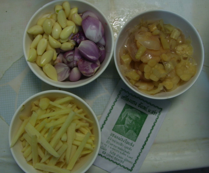 สันคอหมู 1 กก.+ สมาชั้น 1 กก.+พื้นท้องอีก 1 กก. น้ำพริกแกงเผ็ด เครื่องปรุงส่วนผสมตามรูป คลุกเคล้าให้ทั่ว ทิ้งไว้สัก ครึ่งชั่วโมง