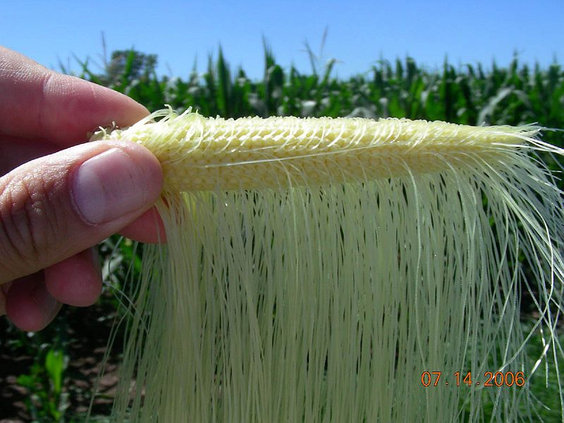 จากรูปจะเห็นไหม (silk) อยู่ที่ดอกตัวเมีย ซึ่งไหมแต่ละเส้นจะติดกับแต่ละเมล็ด ตามที่ท่านอื่นๆ ได้บอกไปแล้ว