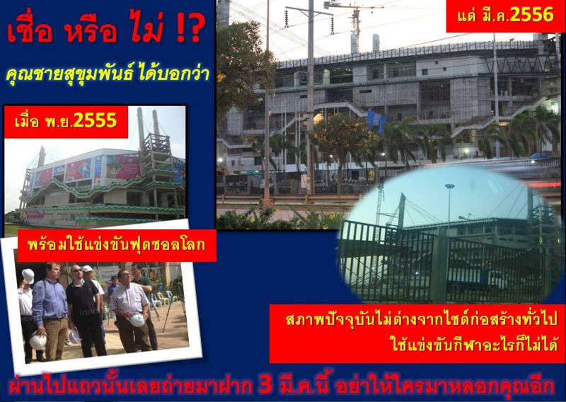 ถ้าสร้างเสร็จจะเป็ฯแบบนี้ แต่ที่สร้างไม่เสร็จและไม่ทันกำหนดการแข่งขัน สภาพแบบนี้ ผมเลยมาวิงวอนให้ ช่วยกันเลือกท่านสุขุมพันธ์ ให้โอกาศท่านได้สร้างสนามฟุตซอลโลกให้เสร็จครับ
