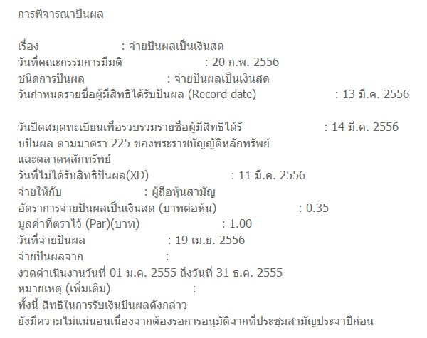 การพิจารณาปันผล เรื่อง : จ่ายปันผลเป็นเงินสด วันที่คณะกรรมการมีมติ : 27 พ.ค. 2556 ชนิดการปันผล : จ่ายปันผลเป็นเงินสด วันกำหนดรายชื่อผู้มีสิทธิได้รับปันผล (Record date) : 11 ก.ค. 2556 วันปิดสมุดทะเบี