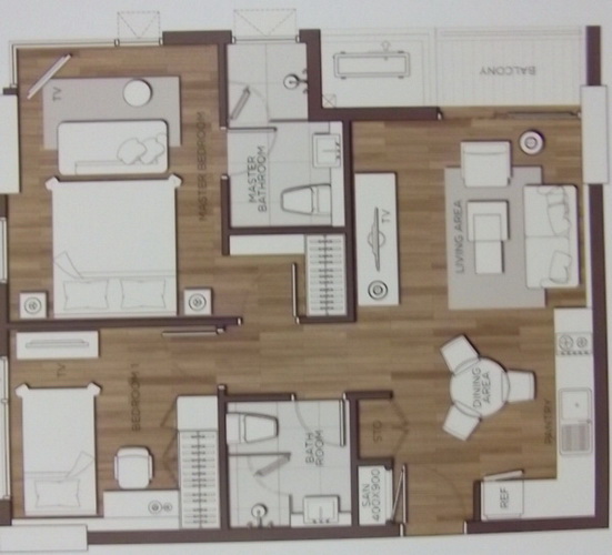 เป็นห้องขนาด 60 ตารางเมตร มี 2 ห้องนอน 2 ห้องน้ำ อยากขยายห้อง แต่โครงการยังไม่เสร็จค่ะ