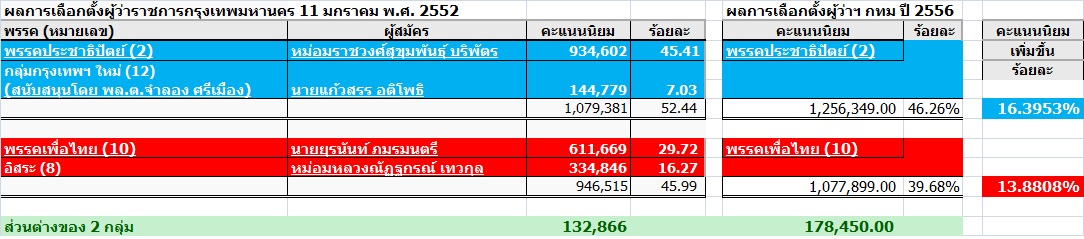 ลองเปรียบเทียบดีๆ ผลการเลือกตั้งผู้ว่าฯ กทม ปี 2552 เทียบ ปี 2556 ระหว่างผู้สมัคร ปชป. และ พท.