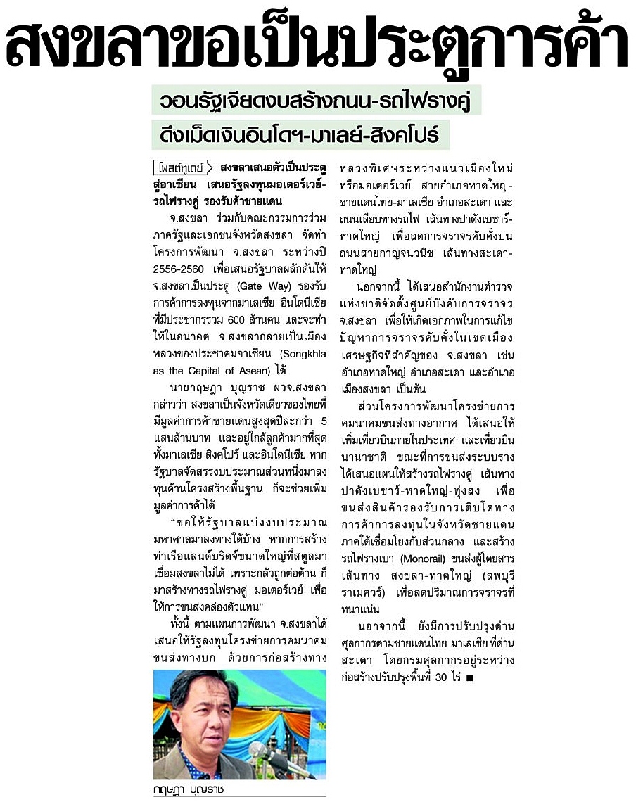 สงขลา ขอเป็นประตูการค้า วอนรัฐเจียดงบ สร้างถนน-รถไฟรางคู่