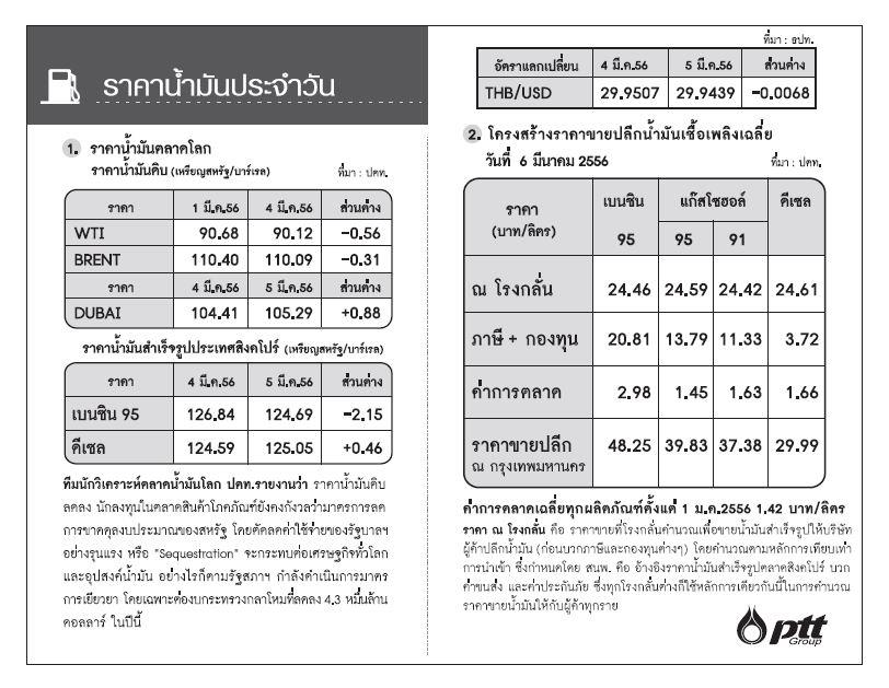 อัพเดทราคาน้ำมันประจำวันที่ ๖ มีนาคม ๒๕๕๖