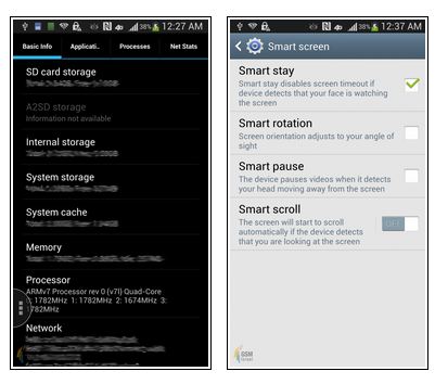 ในส่วนของสเปคภายในเผยภาพมาเป็น CPU แบบ Quadcore 1.8 GHz และแรมขนาด 2GB (แสดงจริง 1.79 GB จากการนั่งเพ่งมอง ) และยืนยันตามข่าวว่า Samsung Galaxy S4 จะมาพร้อมกับฟังชั่นที่เล่นกับการจับลูกตาอีกสองฟังชั่นใหม่ นั้นคือ Smart Scroll ความสามารถที่ S4 จะเลื่อนหน้าจอได้เองเมื่อเรากำลังอ่านข้อความบนหน้าจอ และ Smart pause ความสามารถใหม่อีกหนึ่งตัวของ S4 หยุดการเล่นวีดีโอเองในขณะที่เราไม่ได้มองจอ