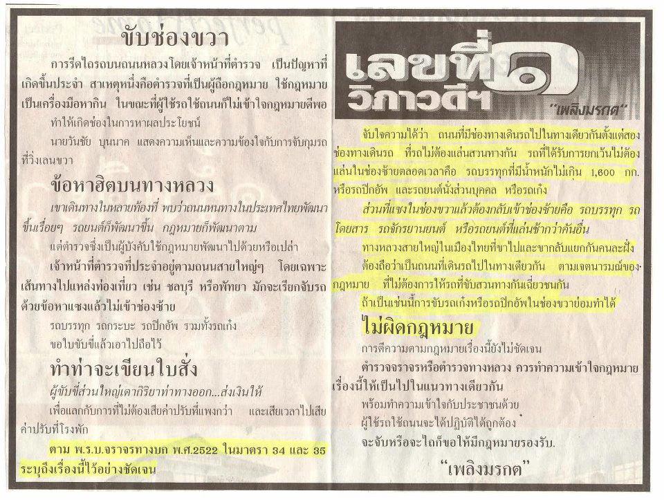 ผมเห็นมีประเด็นเรื่อง รถช้าแช่ขวา ยังไงก็แก้ไม่ได้หรอก เราสามารถแซงซ้ายได้ ไม่ผิดกฏหมาย (ถนนต้องเป็น 4เลน ขึ้นไป) แต่การแซงซ้าย เป็นการแซงที่ไม่ปรกติ รถแช่ขวามีโอกาสเปลี่ยนเลนมาชนได้ โดยเฉพาะถ้าข้างห
