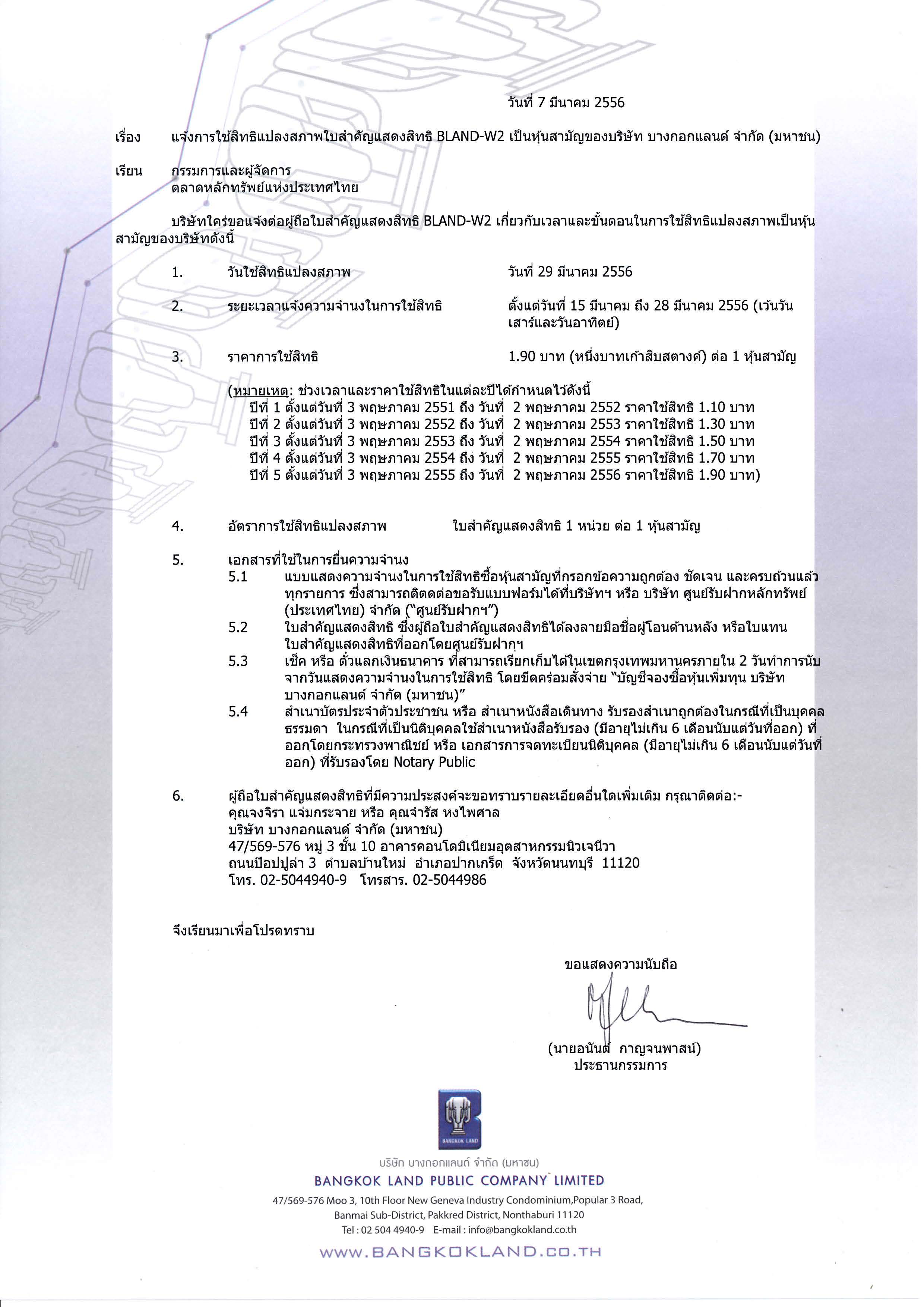 เรื่อง : กำหนดการใช้สิทธิครั้งสุดท้าย วันที่แจ้งสารสนเทศ : 27 ก.ย. 2556 ชื่อหลักทรัพย์ที่กำหนดใช้สิทธิ : BTS-W2 วันปิดสมุดทะเบียนเพื่อพักการโอนใบสำคัญแสดงสิทธิ : วันที่ 21 ต.ค. 2556 ถึงวันที่ 11 พ.ย.