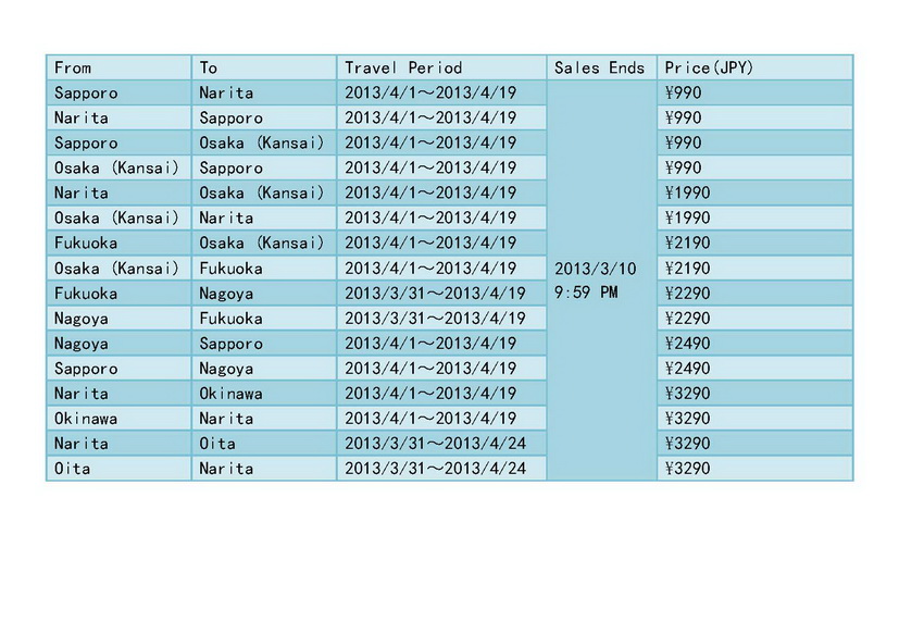 Link : http://www.jetstar.com/jp/en/special-offers Booking Period : Now - 28 Jan Note : ราคาไม่รวมภาษี (ใน ปท. บวกไป 200.- เยน ระหว่าง ปท. ผันแปรตามความไกล) / ค่าสัมภาระ (ถือขึ้นเครื่องได้ 10 กก.)