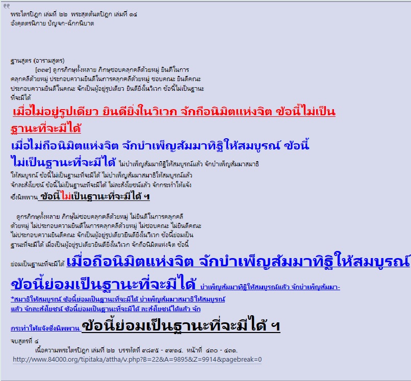 สังคณิการามสูตร (อังคุตตรนิกาย ฉักกนิบาต พระไตรปิฎก เล่มที่ ๒๒) “เป็นไปไม่ได้เลยที่ภิกษุผู้ไม่บำเพ็ญสัมมาสมาธิให้บริบูรณ์แล้วจักละสังโยชน์ ทำพระนิพพานให้แจ้งได้” ข้อ ๑ “เป็นไปไม่