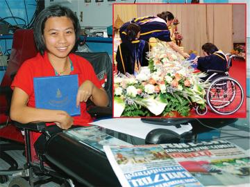 "น้องน้อย"บัณฑิตสาวพิการ ม.รามฯ เปิดใจนาทีแห่งความปลื้มปีติ สมเด็จ พระเทพฯตรัส "จับสองมือได้มั้ย" ก่อนโน้มพระวรกายพระราชทานปริญญาบัตรให้อย่างไม่ถือพระองค์ เผยก่อนรับใบปริญญาทั้งประหม่าและตื่นเต้นจนสองมืออ่อนแรง พยายามใช้มือหนีบแต่ไม่ถนัด กระทั่งได้ยินพระองค์ตรัสถามพร้อมประทับยืนและโน้มพระวรกายลงมา จึงคว้าใบปริญญามาจับแน่นด้วยความซาบซึ้งในพระมหากรุณาธิคุณ ฝากถึงคนพิการอย่าท้อแท้