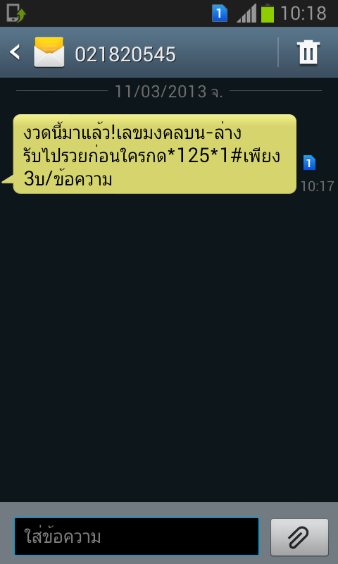 26 ตุลาคม 2556 โทรไป 1331 เพื่อยกเลิก SMS ขยะ 16 พฤศจิกายน 2556 โทรไป 1331 เพื่อยกเลิก SMS ขยะ 21 พฤศจิกายน 2556 จะต้องให้โทรไปยกเลิกอีกรอบเหรอ?? โทรครั้งนึง เสีย 3 บาทนะแก เสียเวลาอีกอย่างน้อยก็ 5 น