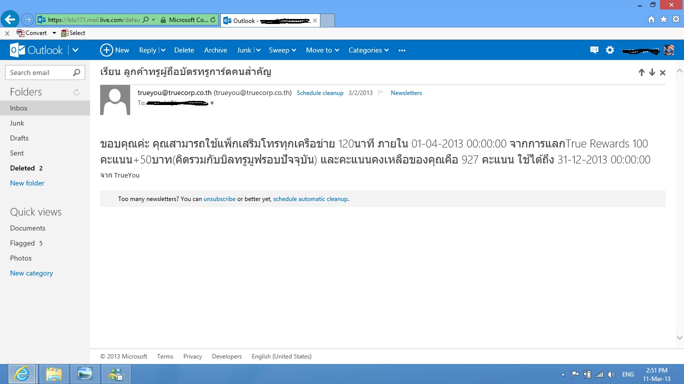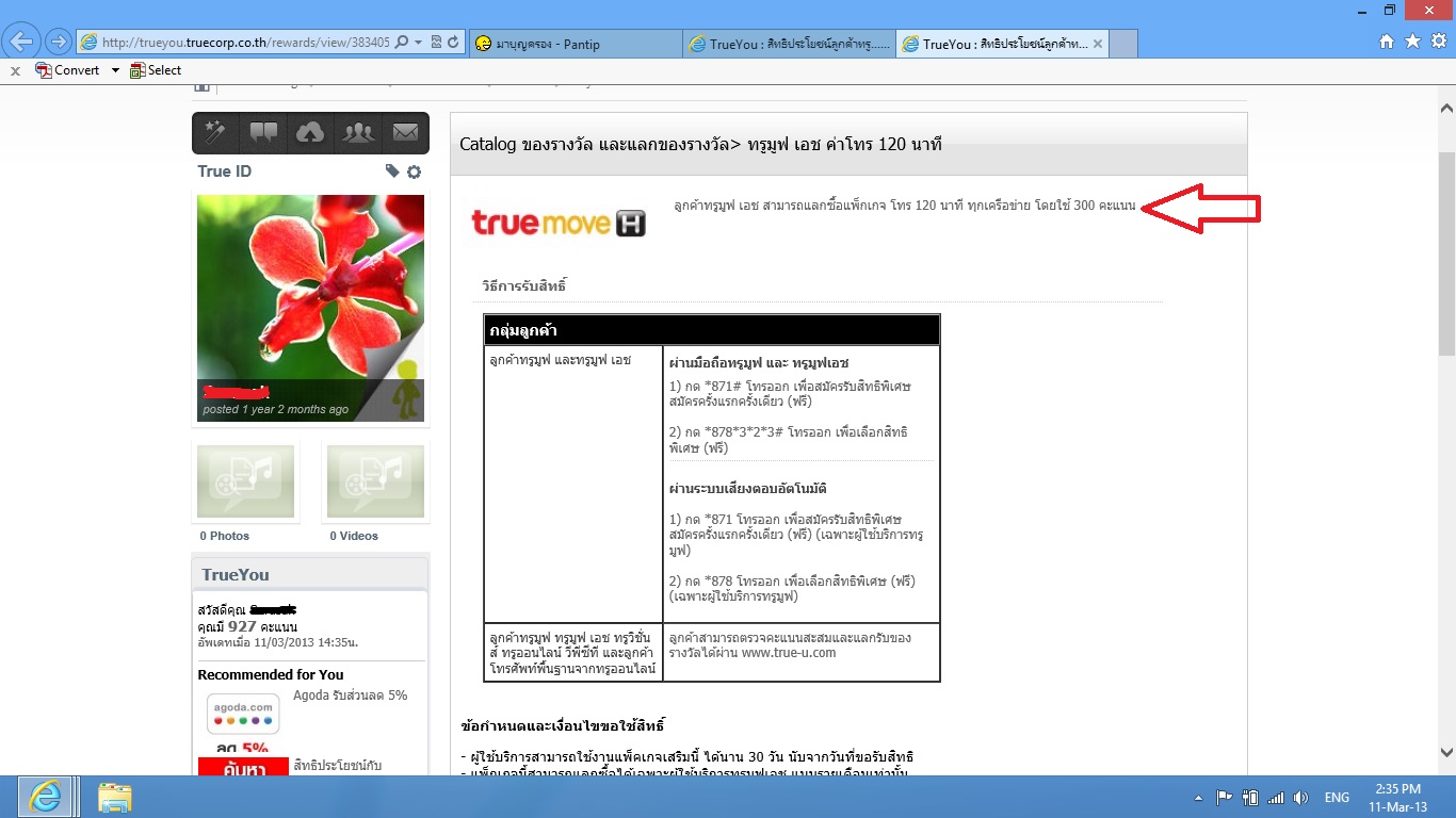 เมื่อวันเสาร์ก่อน (2/มี.ค/56) เข้าไปตรวจสอบคะแนน True Rewards ปรากฎว่ามีอยู่ 1,027 คะแนน เลยอยากแลกรางวัล โดยใช้ 300 คะแนน แลกกับโทรฟรี 120 นาทีทุกเครือข่าย พอทำรายการเสร็จ ก็ได้รับทั้ง SMS และ E-mail ยืนยันว่าเป็นว่า ได้โทรฟรี 120 นาที แต่ถูกคิดเงิน 50 บาท + ตัดคะแนนไป 100 คะแนน จึงโทรไปถาม 1331 ได้คำตอบว่าจะมีเจ้าหน้าที่โทรกลับไปแจ้ง หลังจากนั้นไม่เคยมีใครจาก True เลยที่ติดต่อมา ผมโทรไปถามอีก 2 ครั้ง ในวันต่อๆมา ก็แค่บอกเหมือนเดิมว่ามีคนติดต่อมา แต่จนป่านนี้ก็ไม่มีใครติดต่อมาซักคน ความจริงไม่ได้เสียดายเงิน 50 บาทหรอก แต่ดูเหมือนถูกเอาเปรียบ และไม่อยากให้ลูกค้า True รายอื่นประสพปัญหา และถูกเอาเปรียบแบบนี้ อยากฝากไปยัง True ให้รีบแก้ไขระบบ อย่าให้เป็นการโกง (โดยอาจไม่เจตนา) และขอแบ่งปันประสพการณ์กับ True กับเพื่อนๆ ให้พึงระวังในการแลกของรางวัลกับ True Rewards