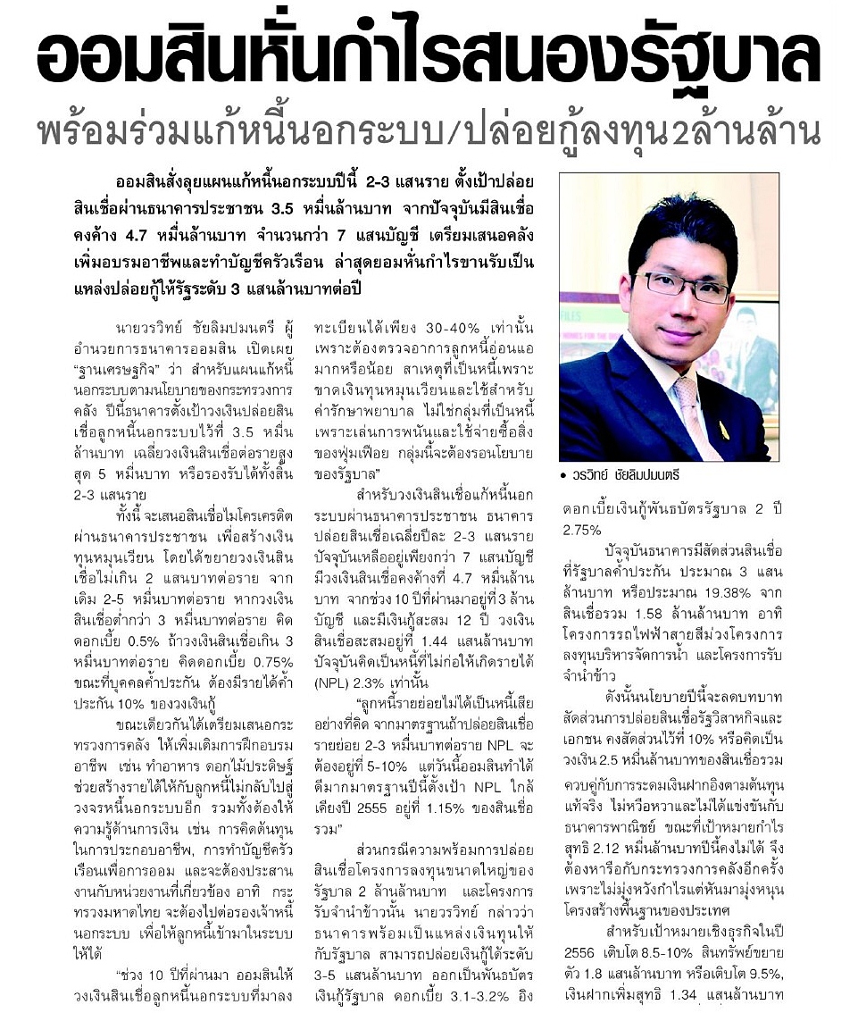 ออมสินหั่นกำไรสนองรัฐบาล พร้อมร่วมแก้หนี้นอกระบบ/ปล่อยกู้ลงทุน 2 ล้านล้าน