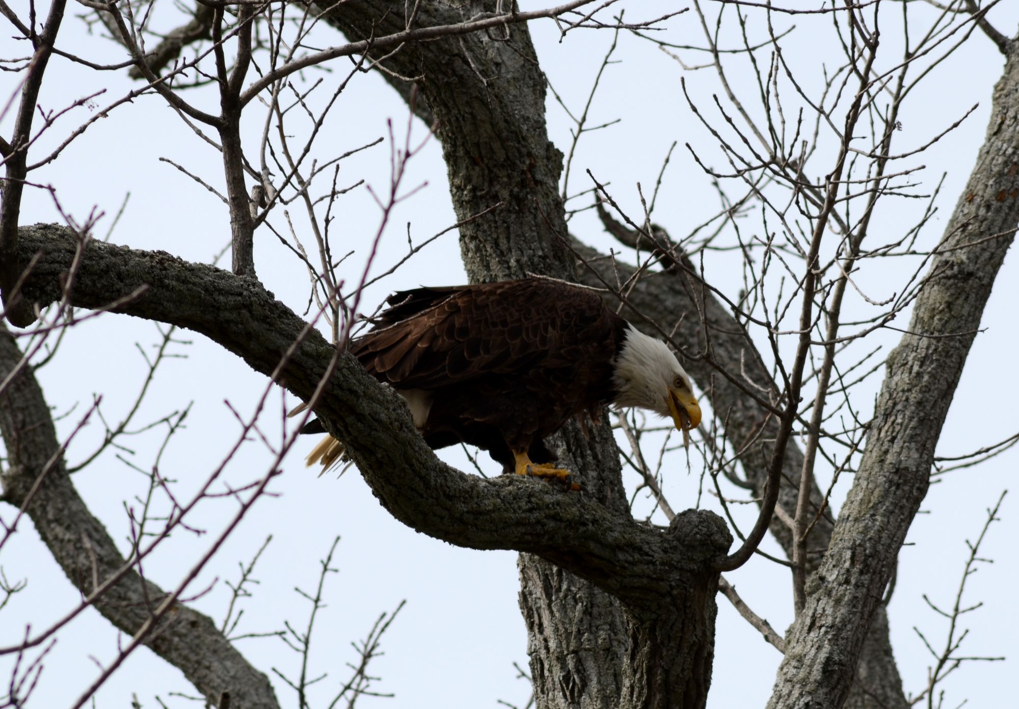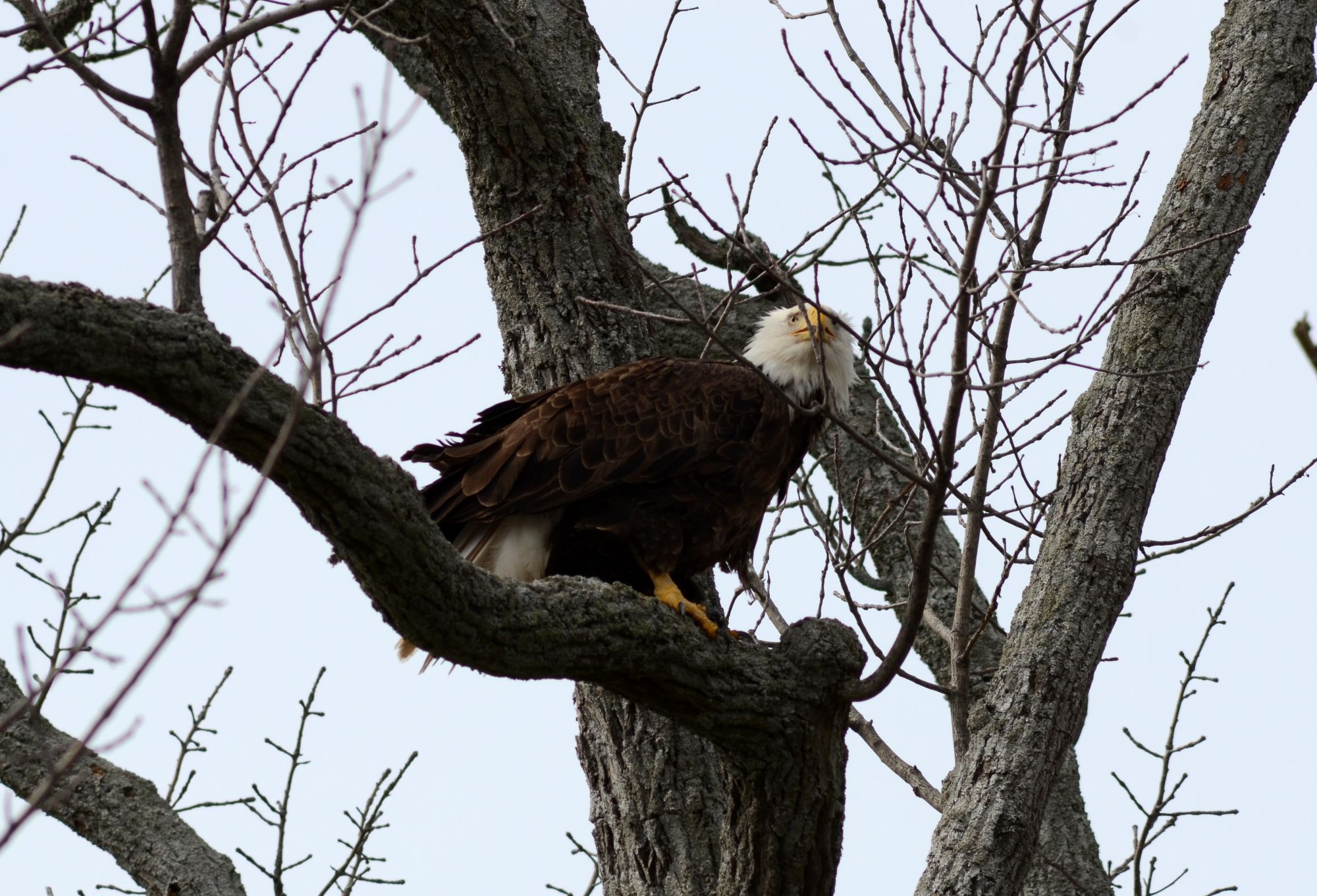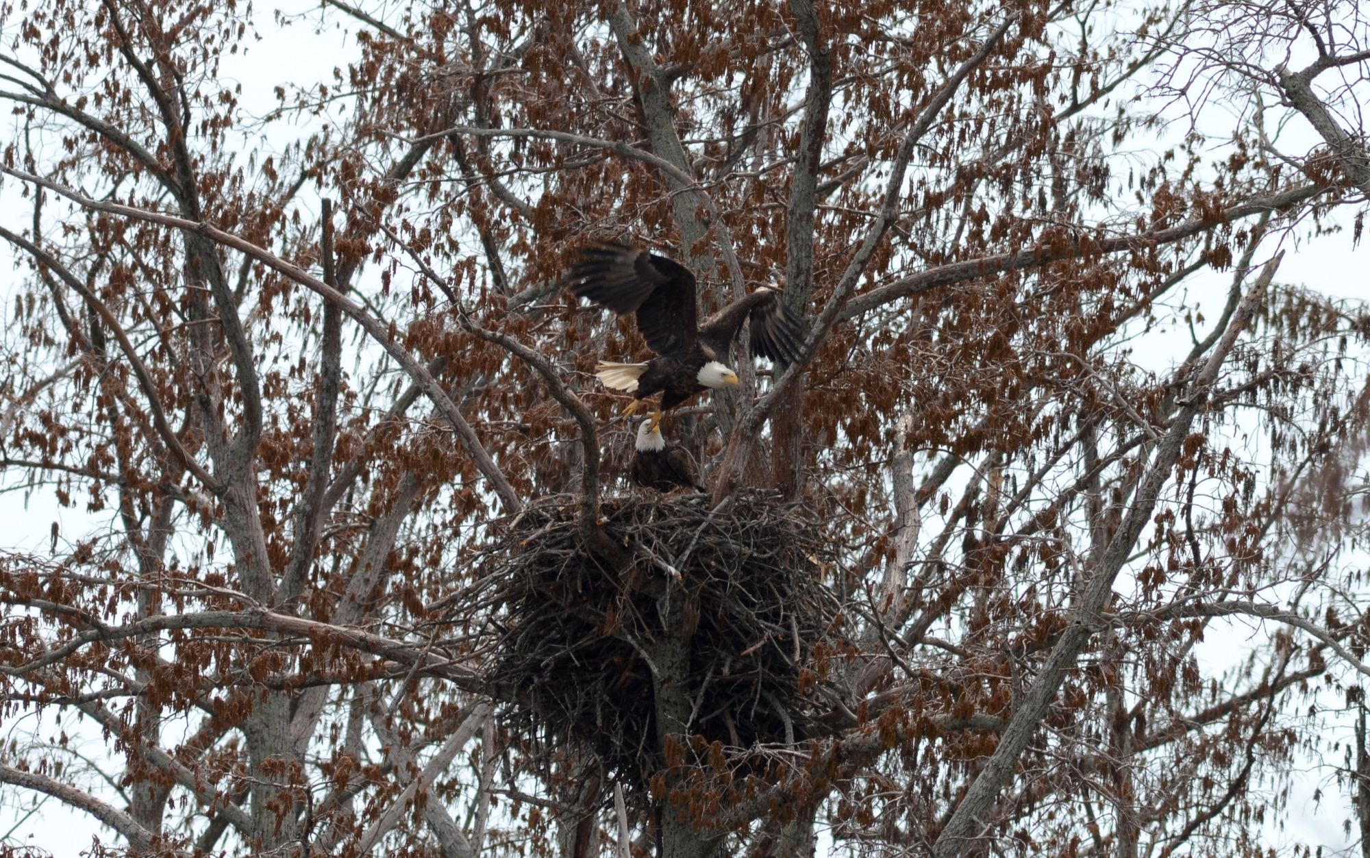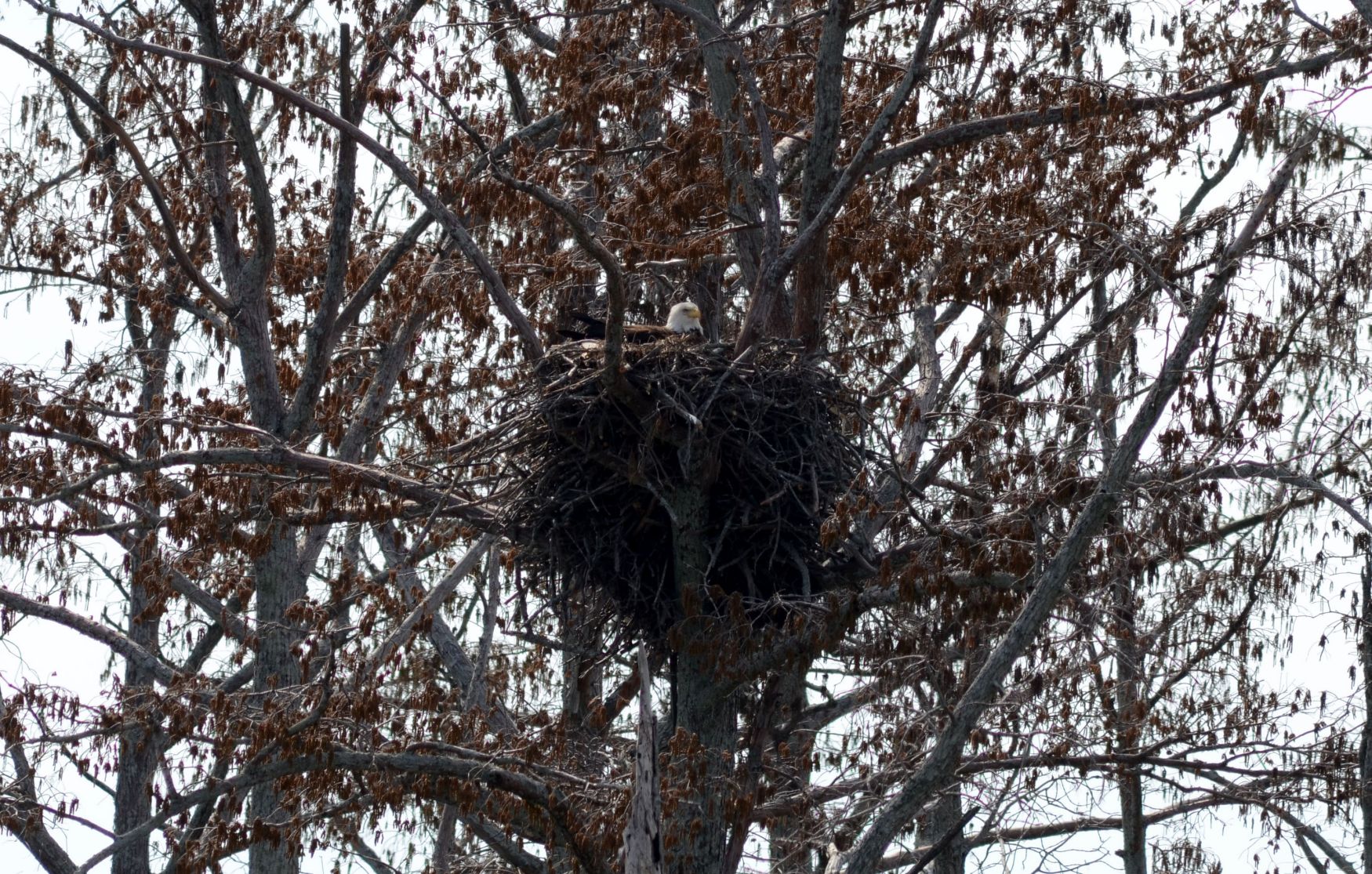 ผมจัดการตั้งขากล้องติดตั้งกล้องหาทำเลตั้งขาเพื่อให้ได้มุมที่กิ่งไม้ไม่บังและใกล้ที่สุดก็คือตั้งขากล้องใกล้น้ำที่สุดแล้วรอ รอ และรออยู่ประมาณชั่วโมงอินทรีที่กกไข่อยู่ในรังก็ไม่ขยับสักทีจนกระทั่งน้าเอเรียลผู้ติดตามล่าถ่ายอินทรีที่ทะเลสาบนี้แทบทุกวันผู้ที่มีดวงเจออินทรีมากกว่าผมเยอะขับรถคลานมาจอดเงียบๆเดินลงมาคุยกับผมไม่นานก็ชี้บอกว่าโน้นไงอีกตัวดูท่ากำลังจะบินกลับรังแล้วน้ารีบไปประจำการที่กล้องด่วน! ผมก็รีบเข้าไปส่องกล้องเตรียมเล็งพออินทรีอีกตัวบินลงไปในรังก็เริ่มกดชัตเตอร์ได้ภาพนี้มา