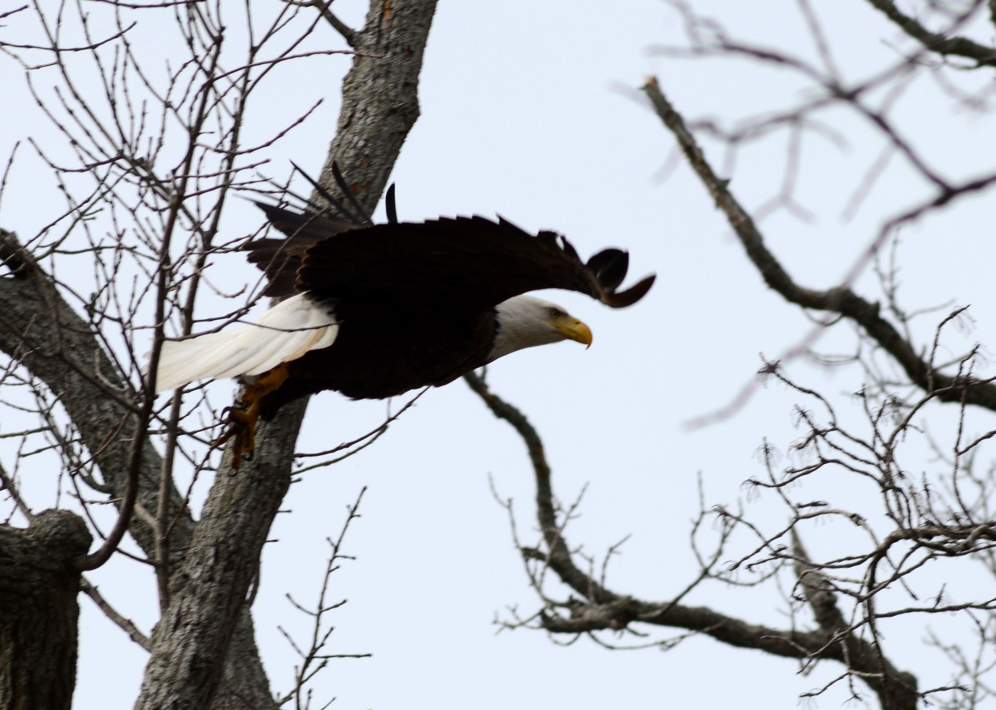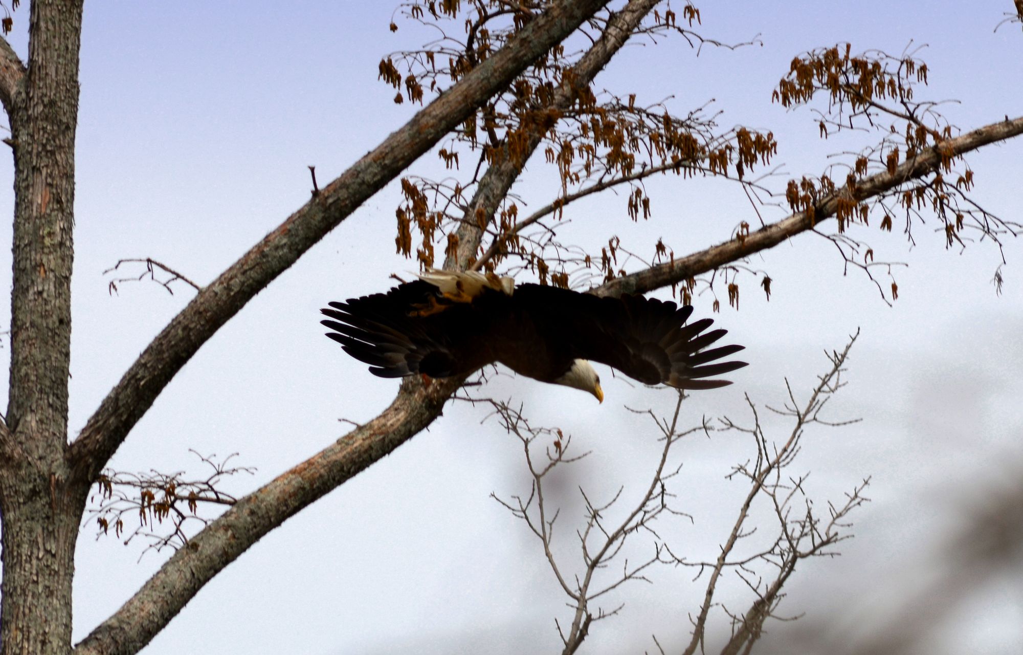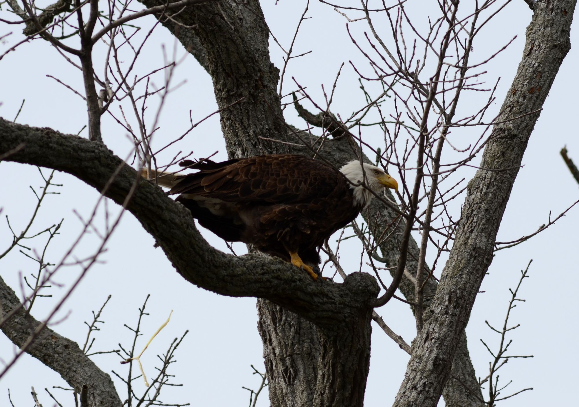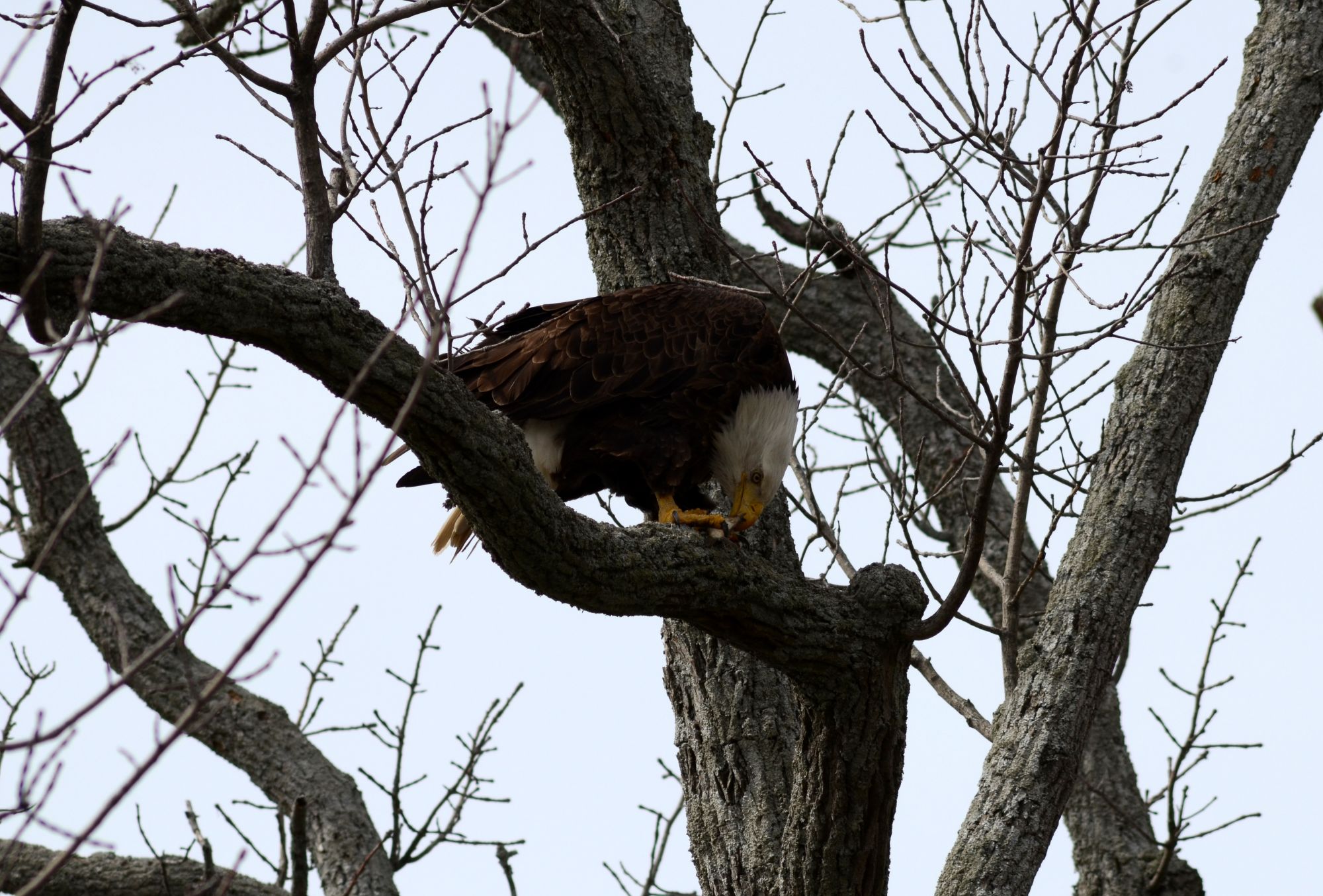 ผมจัดการตั้งขากล้องติดตั้งกล้องหาทำเลตั้งขาเพื่อให้ได้มุมที่กิ่งไม้ไม่บังและใกล้ที่สุดก็คือตั้งขากล้องใกล้น้ำที่สุดแล้วรอ รอ และรออยู่ประมาณชั่วโมงอินทรีที่กกไข่อยู่ในรังก็ไม่ขยับสักทีจนกระทั่งน้าเอเรียลผู้ติดตามล่าถ่ายอินทรีที่ทะเลสาบนี้แทบทุกวันผู้ที่มีดวงเจออินทรีมากกว่าผมเยอะขับรถคลานมาจอดเงียบๆเดินลงมาคุยกับผมไม่นานก็ชี้บอกว่าโน้นไงอีกตัวดูท่ากำลังจะบินกลับรังแล้วน้ารีบไปประจำการที่กล้องด่วน! ผมก็รีบเข้าไปส่องกล้องเตรียมเล็งพออินทรีอีกตัวบินลงไปในรังก็เริ่มกดชัตเตอร์ได้ภาพนี้มา