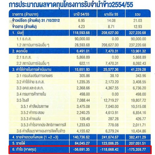 ผู้สื่อข่าวรายงานจากกระทรวงการคลังว่า ขณะนี้คณะกรรมการปิดบัญชีโครงการรับจำนำข้าวได้เริ่มประเมินผลการโครงการรับจำนำข้าวของรัฐบาล ในปีฤดูการผลิต 54/55 พบว่า โครงการนี้อาจมีผลขาดทุนสูงถึง 200,000 ล้านบาท