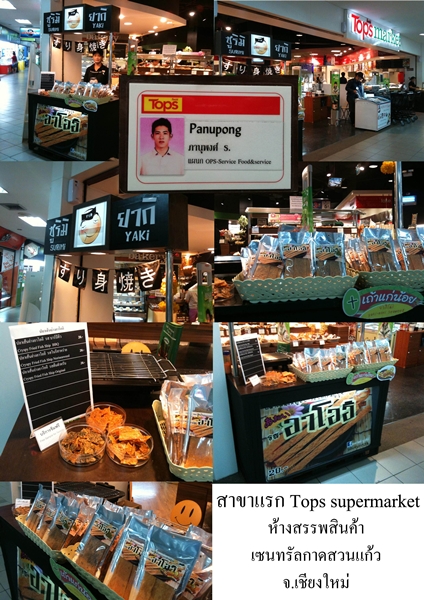 ......สุดท้ายโชคก็เข้าข้างผม ผมไปลองไปที่ Tops Supermarket ในห้างเซ็นทรัล กาดสวนแก้ว ผมเข้าไปถามผู้จัดการสาขา ว่าพอจะมีพื้นที่ว่างให้ผมประมาณ เมตรคูณเมตร มั๊ย ผมจะขายปลาเส้นย่าง ซองละ 20 บาท ...คำตอบของพี่เขาคำแรกคือ "ตอนนี้ไม่มีที่ว่างเลย อีกสองสามเดือนถึงจะว่าง" ถอดใจเลยสิครับ ต้องรออีกสามเดือนกว่าจะได้เริ่มขายแล้วทำไงดี.... ผมก็เลยหยิบปลาทาโร่กรอบและก็แบบโต๊ะคีออส แล้วก็รายละเอียดที่เตรียมมา ให้พี่เขาดู พี่ผู้จัดการชิมปลาทาโร่กรอบ แล้วเขาก็พูดว่า "ตามพี่มา" ก็ลุกขึ้นแล้วชวนผมเดินไปดูที่ว่างด้านหน้า Tops เลยทันทีครับ ....พี่เขาไม่เก็บค่าเช่า แต่จะขอแบ่งเปอร์เซ็นต์แทน จ่ายแค่ค่าประกันแค่ 5,000 บาทเท่านั้น ดีใจสุดๆ เลยครับ ลุยเลยสิครับ
