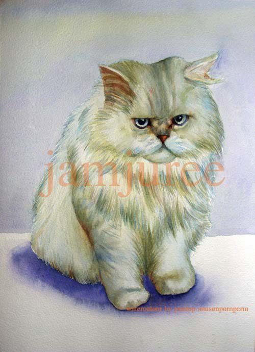 ภาพวาดสีน้ำ น้องแมวสโนวี่ แมวที่บ้านผมเองง่า