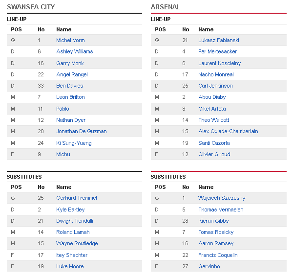 Arsenal: Fabianski, Jenkinson, Mertesacker, Koscielny, Monreal; Arteta, Diaby; Walcott, Cazorla, Oxlade-Chamberlain; Giroud.