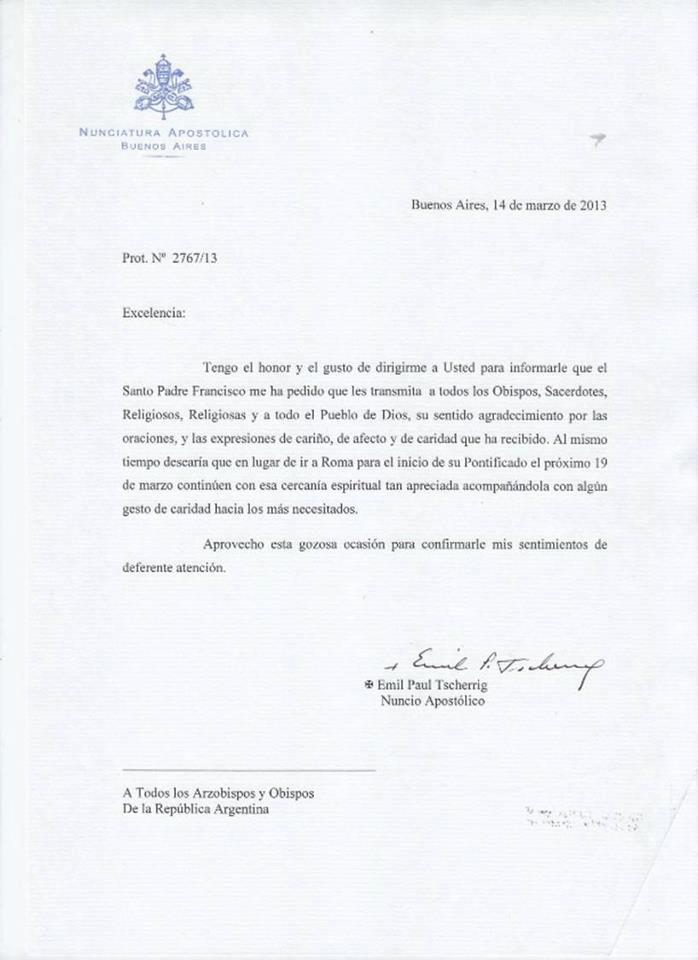 ไม่ต้องซื้อตั๋วเครื่องบินให้เปลืองเงิน แต่นำเงินนี้ไปช่วยคนจนจะดีกว่า - นี่คือจดหมายที่ พระอัครสังฆราช เอมิล พอล ทเชริค สมณทูตวาติกันประจำอาร์เจนติน่า ส่งถึงบรรดาพระสังฆราชทุกสังฆมณฑลในอาร์เจนติน่า เนื้่อหาภายในมีว่า "พระสันตะปาปา ฟรานซิส ได้สั่งตนผ่านทางโทรศัพท์ เพื่อให้มาบอกทุกคนว่า ไม่ต้องซื้อตั๋วเครื่องบินจากอาร์เจนติน่า เพื่อมาร่วมมิสซารับตำแหน่งพระสันตะปาปาในวันอังคารที่ 19 มีนาคม 2013 โดยทรงขอให้นำเงินที่เตรียมจะซื้อตั๋วเครื่องบิน นำไปช่วยคนยากจนจะดีกว่า"