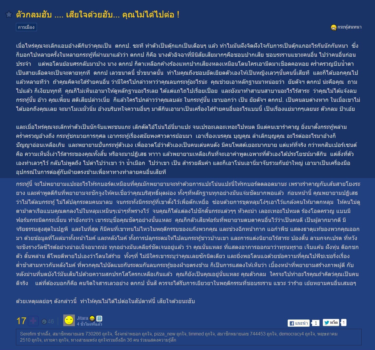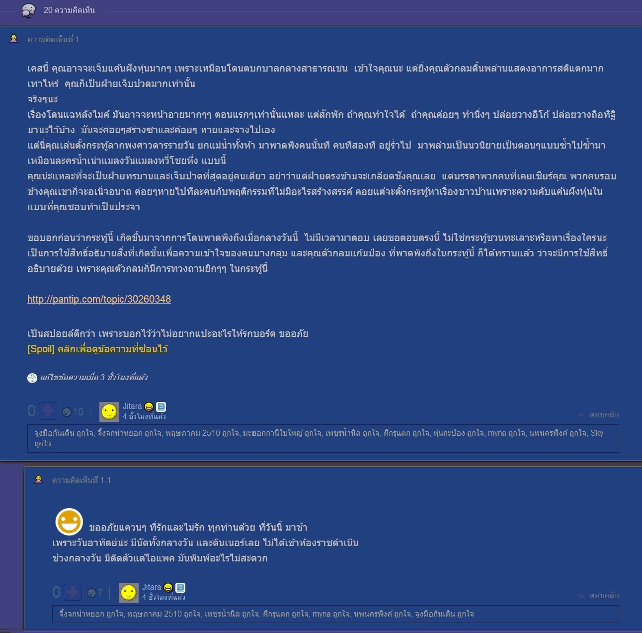 ขอบอกก่อนว่ากระทู้นี้ เกิดขึ้นมาจากการโดนพาดพิงถึงเมื่อกลางวันนี้ ไม่มีเวลามาตอบ เลยขอตอบตรงนี้ ไม่ใช่กระทู้ชวนทะเลาะหรือหาเรื่องใครนะ เป็นการใช้สิทธิ์อธิบายสิ่งที่เกิดขึ้นเพื่อความเข้าใจของคนบางกลุ่ม และคุณตัวกลมแก้มป่อง ที่พาดพิงถึงในกระทู้นี้ ก็ได้ทราบแล้ว ว่าจะมีการใช้สิทธิ์อธิบายด้วย เพราะคุณตัวกลมก็มีการทวงถามยิกๆๆ ในกระทู้นี้