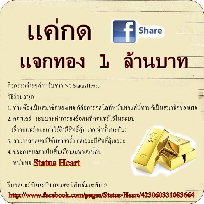 เพื่อนๆคิดว่าไงอะครับ? ถ้าสมมติว่ามันแจกไม่จริงขึ้นมา เพจที่ตั้งมาเพื่อกะกินค่าโฆษณาแล้วมาหลอกให้คนอื่นแชร์ไอ้ทองล้านนึงมาไลค์เพจตัวเองนี่ผมว่ามันแย่มากเลยนะ