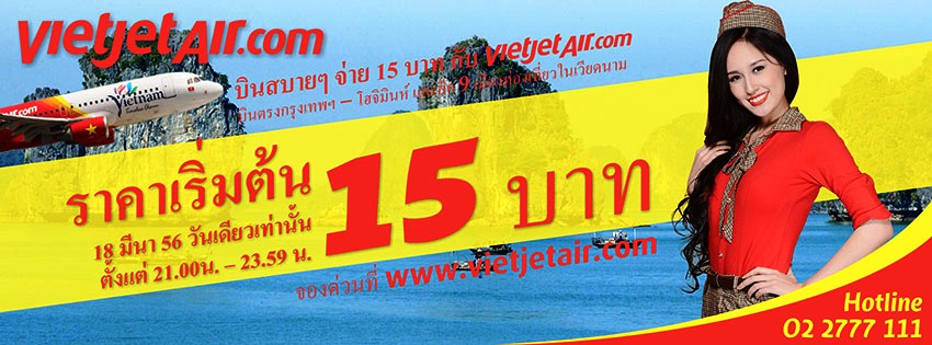 เพิ่งได้ข่าวโปรโมชั่นของสายการบิน VietJetAir มาค่ะ เค้าเปิดบินตรงจากกรุงเทพ - โฮจิมินห์ และอีก 9 เมืองสวยๆ ในเวียดนาม ได้ในราคาเริ่มต้นแค่ 15 บาท แต่เปิดจองแค่วันเดียว วันที่ 18 มีนา นี้ ลองเข้าไปดูท