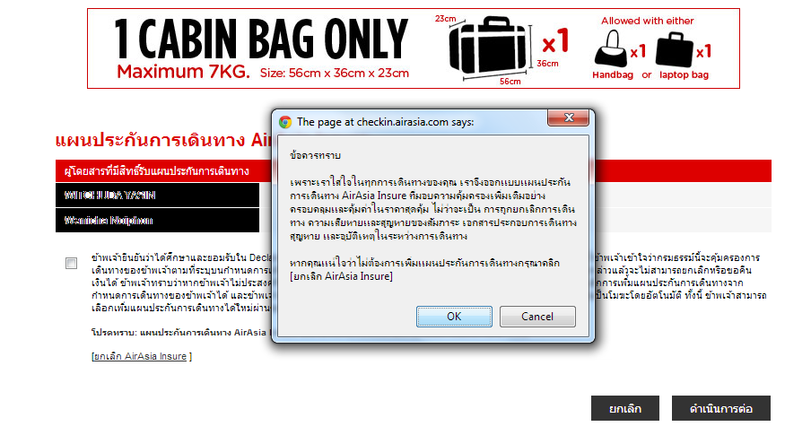 รบกวนผู้รู้หน่อยค่ะ พอดีเพิ่งเคยลอง Web check ของ Air Asia พอมาถึงหน้าที่บอกว่ามีประกันชีวิตเพิ่มถ้าเราไม่ซื้อเพิ่ม 281 บาท เราก็คลิกยืนยันว่าไม่ซื้อ มันก็ขึ้นมาตามรูปนี้ใช่ไหมค่ะ แล้วเราก็ดำเนินการต่อ แต่มันยังขึ้นมาว่าเราได้ซื้อเพิ่ม ก็เลยไม่กล้าดำเนินการต่อกลัวเสียตังค์ค่าประกันเพิ่มอ่ะค่ะ แล้วจริงๆมันต้องดำเนินการยังไง รบกวนผู้รู้ช่วยมาตอบด้วยนะค่ะ ขอบคุณค่ะ