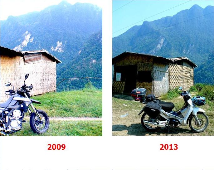 ......เอาภาพเปรียบเทียบมาให้ดูกันครับ จุดเดียวกัน เวลาผ่านไปหลายปีแล้ว ยังคงสภาพเดิมไว้ค่อนข้างดีสำหรับบ้านเก่าๆหลังนี้...จุดนี้อยู่ในเขตเมืองกาสี สปป.ลาว (ภาพซ้ายผมขี่ไปเมื่อปี 2009 จอดเพราะถูกใจบ้านหลังนี้)...หลังจากนั้น ปี 2010-2011-2012 ผมผ่านตรงนี้ทุกปีแต่ไม่ได้แวะจอดถ่ายภาพเลย จนกระทั่งเมื่อเดือน กพ.ที่ผ่านมานี้ ผมได้ผ่านตรงนี้อีกครั้ง และจอดเพื่อถ่ายภาพกับบ้านเก่าหลังนี้อีกครั้ง...เอาภาพเปรียบเทียบมาให้ดูไม่มีอะไรมากครับ เป็นความทรงจำที่ประทับใจในการเดินทางของผมเอามาเล่าสู่กันฟังครับ......