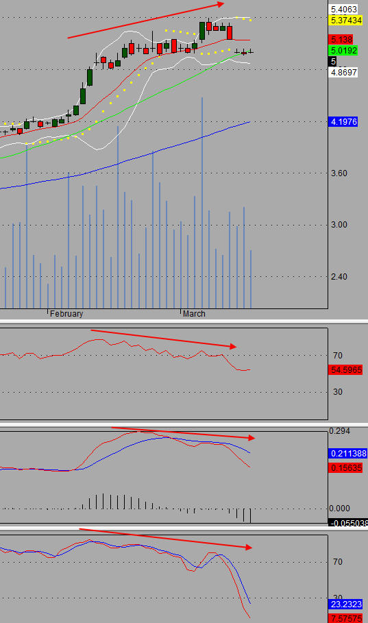 อีกอย่างกราฟราคาหุ้นมันทำ Bearish Divergence ตั้งแต่ตอนราคาขึ้นไป 5.40 บาท แต่อินดิเคเตอร์ RSI , MACD และ Stochastic ต่ำกว่ายอดเดิมโดยพร้อมเพียงกัน อาจจะเป็นสัญญาณการกลับตัวจากขาขึ้นเป็นขาลงนะครับ