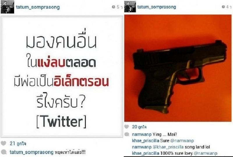 นอกจากนี้ ตั้ม ยังโพสต์ภาพปืน โดยทางด้านของ น้ำหวาน เองก็มาคอมเมนท์คนแรกเลยว่า Ying…Mai? ก่อนที่ Khae_priscilla ผู้ซึ่งเป็นแฟนของตั้มและพี่สาวของน้ำหวาน จะคอมเมนท์ว่า Sure พร้อมแท็กข้อความไปให้ น้ำหวานอีกด้วย นอกจากนี้ ตั้ม ยังโพสต์ภาพข้อความในวันอื่นๆ อีกว่า "มองคนอื่นในแง่ลบตลอด มีพ่อเป็นอิเล็กตรอนหรือไงครับ" พร้อมกับมีข้อความกำกับภาพว่า “หยุดเห่าได้แล้ว!” รวมทั้งภาพข้อความว่า “อย่ามายุ่งกับกู”