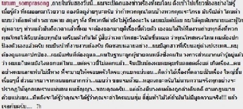 พร้อมกับมีเขียนข้อความใต้ภาพว่า “ประกาศๆ มันผู้ใดดึงตัวและชื่อของ สมประสงค์ เข้าไปเกี่ยวข้องกับเรื่องของครอบครัวคนอื่น ขอบอกว่า จงหยุดการกระทำโดยด่วน..ทะเลาะกับกรูล่ะก็..เรื่องใหญ่แน่ขอบอก..ไปสืบเรื่องให้รู้..แน่ๆ ก่อนค่อยออกมาพูด หรือจะเอาพยานหลักฐานอะไรบอกมา..จะได้ให้..เข้าใจไหม..ตามนั้น!!!” โดยมีแฟนสาวเข้ามาคอมเมนท์สนับสนุนว่า “พวกเราไม่เคยไปหาเรื่องใครก่อน...อย่ามาพาลใส่และใช้ข้อความไม่สุภาพ เราอยู่ตรงกลาง ผิดก็ว่าไปตามผิด ถูกก็ว่าไปตามถูก