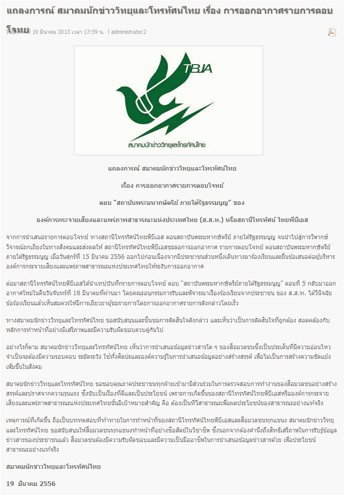 ส.นักข่าวฯแถลงการณ์ ขอทหารยุติคุกคามสื่อ สมาคมนักข่าวนักหนังสือพิมพ์แห่งประเทศไทย ออกแถลงการณ์ 4 ข้อ ขอทหารยุติคุกคามสื่อมวลชนทุกรูปแบบ กรณี กลุ่มทหารเดินทางไปชุมนุม ที่หน้าสำนักงานหนังสือพิมพ์เอเอสท