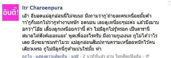 หลังเสร็จพิธีผู้สื่อข่าวก็สอบถามถึงกรณีที่เจ้าตัวโพสต์ข้อความในเฟซบุ๊กว่าแฟนคลับว่า “อ้าว อีบอต แม่ลูกอ่อนนี่ไม่จบนะ ถามว่ากูถ่ายละครเหนื่อยมั้ยค้า กูก็บอกไปว่ากูทำงานหนัก อดนอน เลยดูเหนื่อยๆ นะคะ แล้วมาบอกว่า โอ้ยเลี้ยงลูกเหนื่อยกว่านี้ค่า ไม่มีลูกไม่รู้หรอก เป็นดารานี่สบายได้ตังค์เยอะแยะ พูดเพื่ออะไรครับ ถามกูเองนะ กูไม่ได้ว่าไรเลย จะมาข่มทำไมวะ แม่ลูกอ่อนสัมปทานความเหนื่อยหนักไว้คนเดียวเหรอ กูไม่มีลูกนี่ห้ามบ่นใช่มั๊ย ห่า”