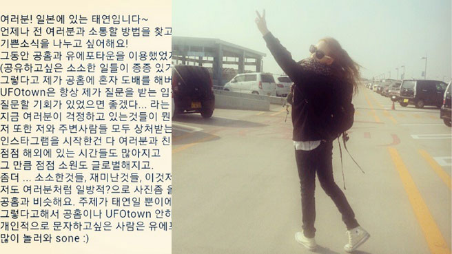 "สวัสดีค่ะ นี่คือแทยอนเองที่อยู่ที่ญี่ปุ่น ฉันพยายามค้นหาวิธีการที่จะได้ติดต่อกับทุกคนและบอกถึงข่าวดีค่ะ ข่าวที่แฮปปี้!