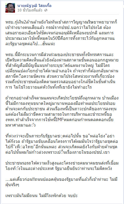ถ้าทุกอย่างสำเร็จตามแผนจะเกิดประโยชน์ถึงลูกหลาน บ้านเมืองนี้ไม่มีการลงทุนขนาดใหญ่มานานพอลงมือทำผลประโยชน์รอบด้านจะตกกับประชาชน ส่วนเรื่องหนี้เป็นภาวะปกติของการลงทุนแต่ต้องไม่ลืมว่าขีดความสามารถในการบริหารและชำระหนี้ของพท.ทำสำเร็จจากการใช้หนี้IMFหมดก่อนกำหนดลดดอกเบี้ยมหาศาลมาแล้ว