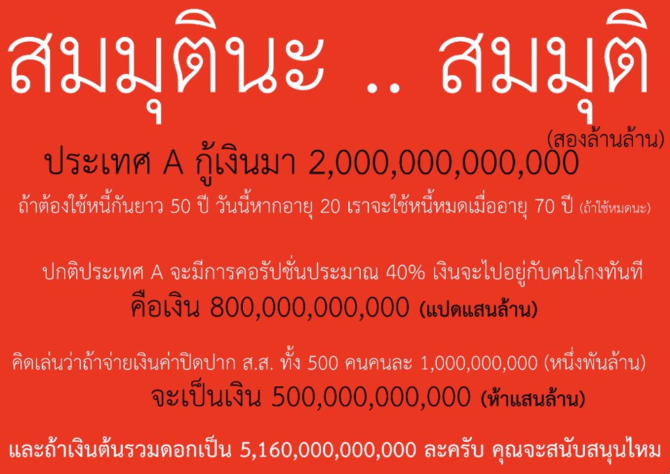 คิดเล่นๆยัดปากไปคนละพันล้าน ก็จะเป็นอัตราที่น้อยกว่าค่าคอมมิสชั่นคอรับชั่นถึงสามแสนล้าน กินอิ่มกันถึงชาติหน้าทุกคน ส่วนประชาชนในชาตินี้ช่างมัน