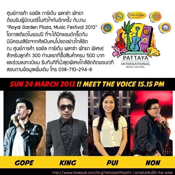 เพิ่มเติมคือ วันที่ 24 ที่จะถึงนี้ มันจะมีงาน Pattaya International Music Festival มีนักร้องจาก The Voice ไปด้วย ได้แก่ คุณคิง คุณปุ้ย น้องนนท์ พี่กบ งานเริ่มบ่ายสามโมง จัดที่ Royal Garden Plaza เราไม่แน่ใจว่าเป็นงานฟรีหรือเสียบัตร ยังไงลองดูตามรูปที่แนบมานี้ เอามาจากเฟซพี่กบ ที่ก็รับมาจากเพจแฟนคลับคุณคิงอีกต่อนึง ฮ่าๆ ไม่ได้ไปอ่านที่อื่นเลยว่าเขาว่ายังไงกันมั่ง เอาเป็นว่าใครสนใจอยากไปก็ไปหาข้อมูลเพิ่มเติมเอาแล้วกันนะเคอะ