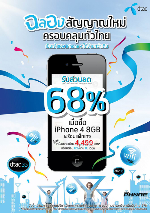 - iPhone 4 8GB มอบส่วนลดสูงสุด 68% ฉลองสัญญาณใหม่ทั่วประเทศ ลูกค้าดีแทครายเดือนปัจจุบันและลูกค้าใหม่ ที่ซื้อเครื่อง iPhone4 8GB พร้อมสมัครแพ็กเกจ รับส่วนลดพิเศษ 2 ส่วน