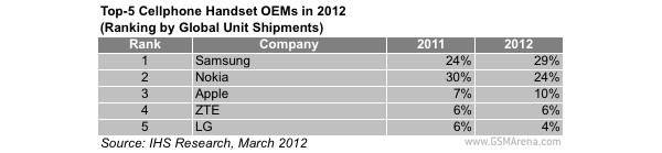 ในปี 2011 ที่ผ่านมานั้นทาง Samsung ยังตามหลังทาง Nokia อีกพอสมควร ไม่น่าจะเป็นไปได้ที่ปีเดียวทาง Samsung กลับมาแซงทาง Nokia ไปซะอย่างงั้น ซึ่งในปี 2012 เองก็ถือเป็นปีที่ Samsung ผงาดมากๆในแง่ของ Market share และในปี 2013 นี้เองก็น่าจะยังคงพุ่งทะยานขึ้นไปอีก