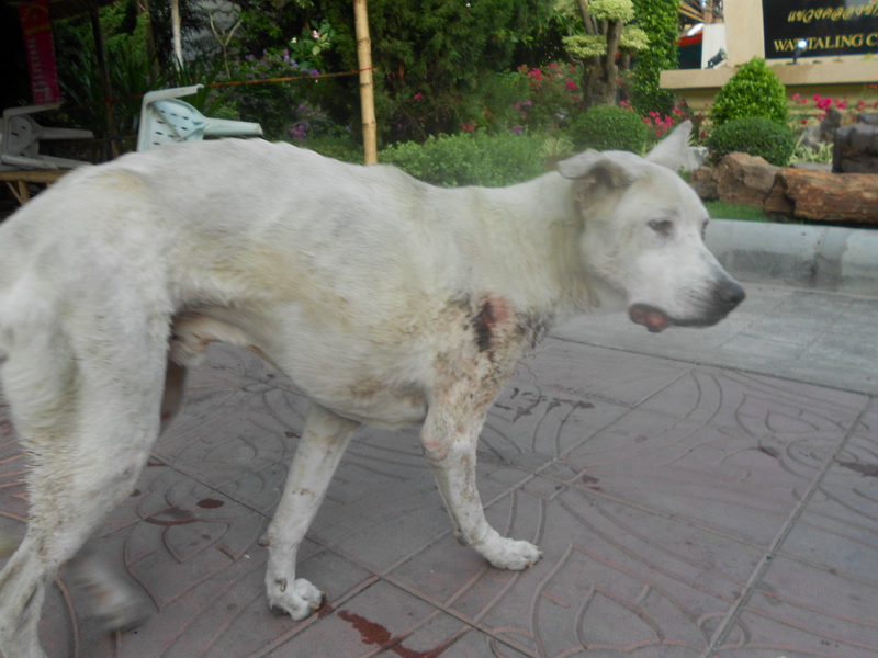 สภาพที่เห็นภายนอก ผอมเห็นแต่กระดูก ปากมีก้อนเนื้อใหญ่มาก มีเลือดออกตลอดเวลา พร้อมน้ำลาย เหมือนเค้าจะทานอะไรไม่ได้เลย แม่ค้าแถวนั้นเค้าบอกว่า โดนหมาอื่นกัดทุกวันเลย เห็นแล้วสงสารสุดๆ ค่ะ อยากให้มีคนใจดี หรือใครที่พอจะรู้จักหน่วยงานไหน หรือติดต่อหน่วยงานไหนได้ อยากให้ช่วยประสานงานด้วยค่ะ คือเราพูดตรงๆเลย อยากช่วยเค้าค่ะ แต่กำลังทรัพย์เราก็มีไม่มาก ขายของ 2 วัน แทบไม่ได้กำไรเลย แต่จะพยายามช่วยเท่าที่ช่วยได้ค่ะ คือเห็นแล้วไม่อยากปล่อยผ่านไปเฉยๆ เดินไปเจอเค้าอีกรอบ บอกเค้าว่า จะหาคนมาช่วยพาไปรักษานะ เหมือนเค้าฟังเรารู้เรื่อง ไม่เดินหนีเหมือนตอนแรก มองหน้าเรา เห็นแล้วน้ำตาจะไหล (ขณะที่พิมพ์น้ำตาเอ่อ แล้วค่ะ )