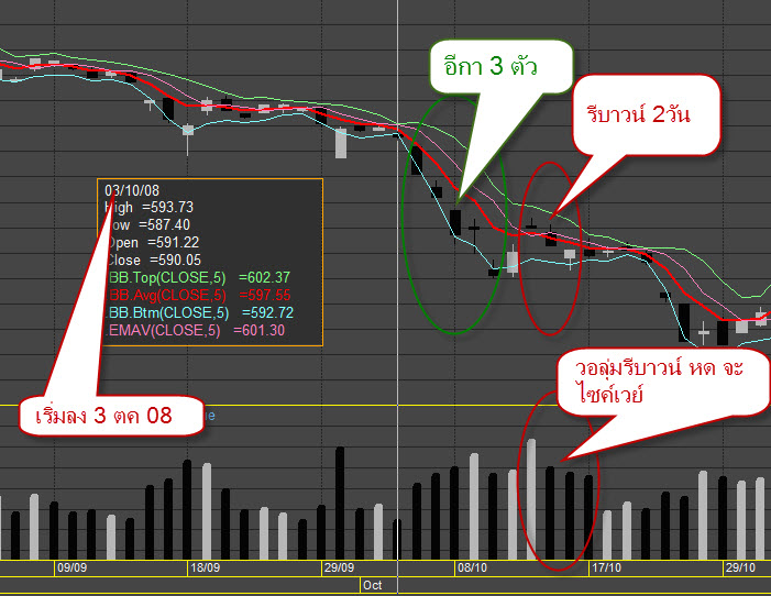 เสาร์อาทิตย์ที่ผ่านมา เปิดห้องสินธรเจอแต่เรื่อง อีกา 3 ตัว( ความจริง 5 ตัว ลง 5 วันติดกัน) แล้วพอวันจันทร์ ดัชนีดีดกลับ +44 จุด กระทู้อีกาหายหมด แสดงว่า ทุกท่านกำไรหมด ? แต่ในความเป็นจริง ยังมีคนติดหุ้นอีกเยอะ ลองมาดู กราฟสมัย ตค ปี 2008 มีหน้าตา อีกาคล้ายกัน แต่เงื่อนไขการขึ้นลงต่างกัน จึงต้องไปดูเรื่องวอลุ่มไว่เปรียบกัน ก็ผากให้ช่วยกันจินตนาการว่า ดัชนีจะไปต่อ ทุกคนละลงดอยในเร็ววันหรือ ยังนอนรับลมร้อนต่อช่วง เมษานี้ ขอให่้ระวังหน่อย อย่าคิดเข้าข้างตนเองมากนัก เงินจำนวนมากแบบวันศุกร์ที่ผ่านมา ไม่ใช่เอามาโยนเล่นได้ ทุกวัน ทั้งเหนื่อยและมีทุนการกระทำมากมาย ต่อให้มีเปิด กองทุนล่ารางวัลเปิดใหม่ มากก็ตาม