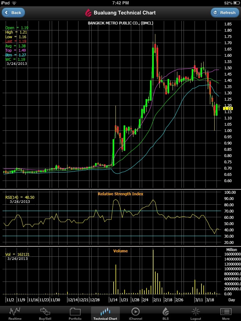 Banpu เข้าสภาวะขาขึ้นอีกครั้ง กราฟ 5 นาที ดูเหมือนจะรอทิศทาง พอตลาดปิดจะรู้ทางตัวเองแล้ว แต่อาจจะขึ้นไปเที่ยวคงไม่นาน ตามกราฟนะครับ ส่วนกราฟ 1 วัน ก็ดูเป็นช่วงระยะเริ่มของขาขึ้นครับ วันจันทร์