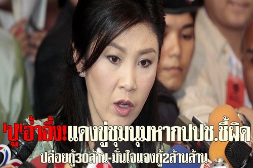 เท็จของน.ส.ยิ่งลักษณ์ กรณีการปล่อยเงินกู้ 30ล้านบาท ให้บริษัท แอ็ด อินเด็กซ์ จำกัดของ นายอนุสรณ์ อมรฉัตร สามี กลุ่มนปช.จะออกมาชุมนุมใหญ่ทันที ซึ่งก่อนตอบคำถามน.ส.ยิ่งลักษณ์ ทำหน้ามึนงงก่อนกล่าวแบบอ้ำอึ้งว่า “ก็เอ่อ ก็ ดิฉันเองได้ยื่นรายละเอียดทั้งหมดแล้ว อาจจะต้องรอขั้นตอนตามข้อกฎหมาย ซึ่งต้องรอผลทางปปช.ก่อน”