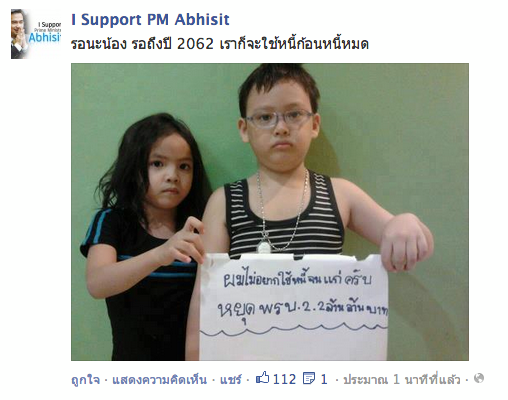 ฉาวอีกแล้ว! แฟนเพจกระบอกเสียงพรรคประชาธิปัตย์ I Support PM Abhisit ใช้เด็กเป็นเครื่องมือทางการเมือง บังคับถือป้ายกระดาษตำหนินโยบายรัฐบาลยิ่งลักษณ์ ทางด้านชาวเน็ตสวดยับเป็นถึงพรรคเก่าแก่กลับเล่นเกมการเมืองสกปรก สีหน้าเด็กบอกบุญไม่รับ ทำหน้าเอือมระอาสุดทนแต่เป็นเด็ก ถูกสั่งให้ทำ ไม่ทำไม่ได้