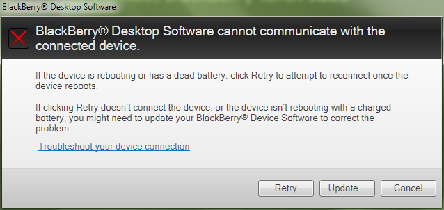 Blackberry แบตหมดแล้วเปิดไม่ติด ชาร์จก้แล้ว มีไฟกะพริบสีแดงนานครั้งละประมาณ 10 วินาที พอต่อเข้ากับ Blackberry Desktop software มันขึ้นแบบในรูปอ่ะครับ จะแกยังไงได้บ้างช่วยทีครับ !!
