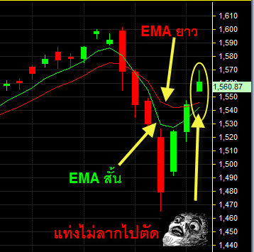 เมื่อแท่งอยู่เหนือค่าเฉลี่ยแล้วไม่ลากเส้นสั้นไปตัดด้วย เข้าตำราการสับขาหลอก ในทางตรงการข้ามเช่นกัน