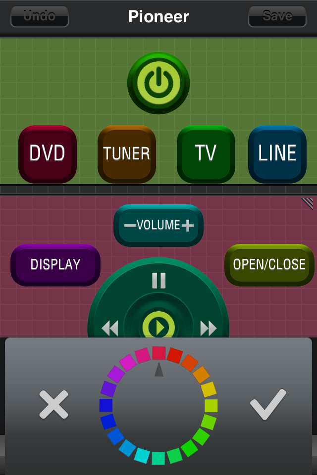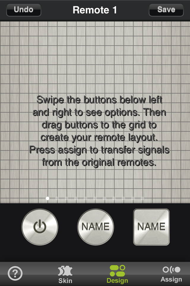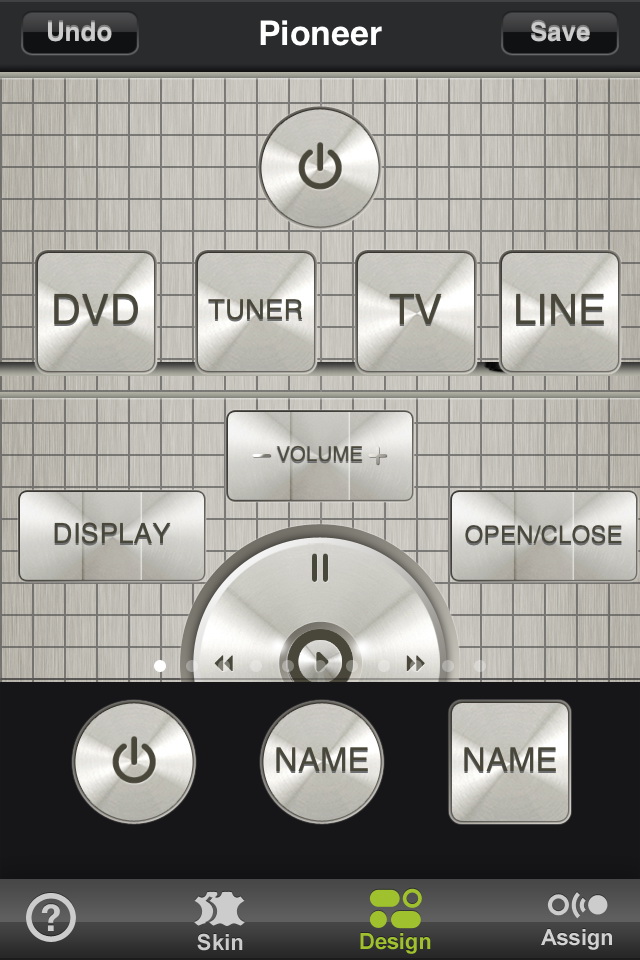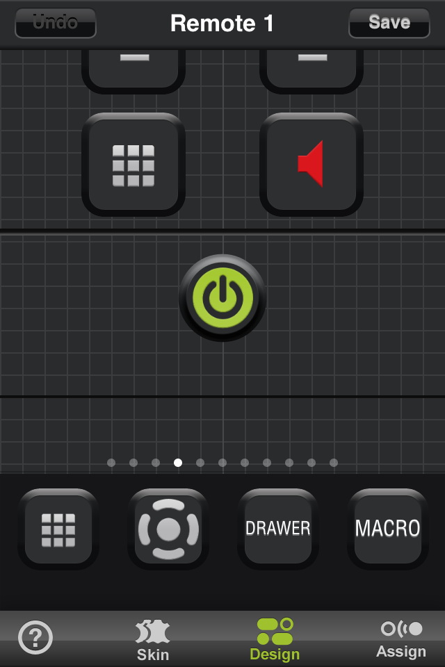 เข้าโหมด setting (รูปฟันเฟีอง) เลือก Design สามารถเลือกปุ่ม templateรีโมทสำเร็จูป หรือสัญลักษณ์ต่างๆ ของเครื่องมือตกแต่ง มาละเลงกันบนหน้าจอกันได้ด้วยการลากแล้ววาง ใส่สี ชื่อ หรือสร้างปุ่มชื่นชอบ(favorite) ที่หน้าจอได้เลย ผมใช้วิธีเทียบปุ่มจากรีโมทจริง แล้วแต่งปุ่มคำสั่งต่างๆ ตาม จัดเรียงป่มต่างๆ เพื่อง่ายต่อการใช้งาน หลังจากนั้นก็ Assign ทีละปุ่มจนครบ