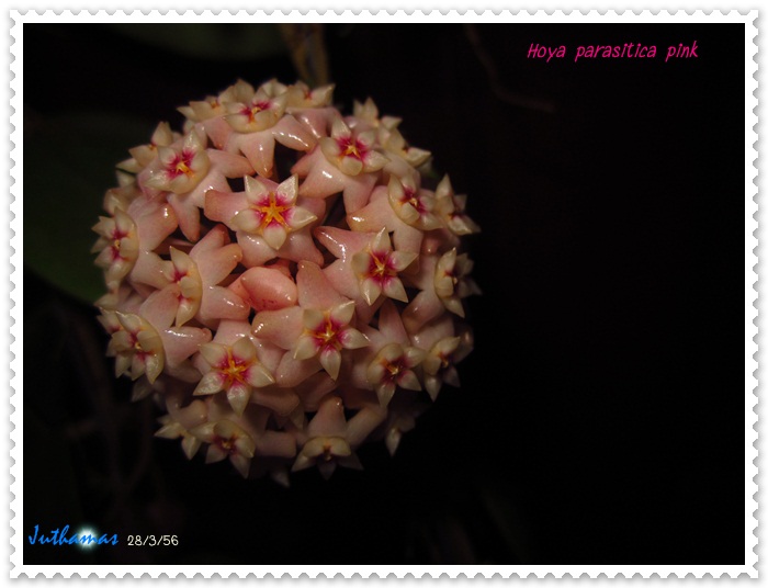 Hoya parasiticaเป็นโฮย่าที่มีถิ่นกำเนิดในไทย เป็นโฮย่าที่มีความหลากหลายทั้งใบและดอก แต่ที่มีเสน่ห์มากที่สุดคือ กลิ่นที่หอม สมกับเป็นไม้ป่าเมืองไทย ต้นแรกได้มาจากการแลกเปลี่ยนโฮย่าพารา จากเกาะกูด ตราด