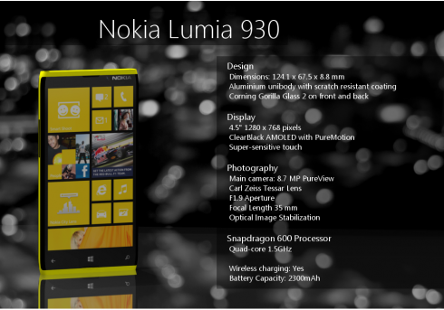 Nokia Lumia 930 measures 8.8 mm in thickness and uses Corning Gorilla Glass 2 on the back and front, plus it has a scratch resistant coating. Upfront we’ve got a 4.5 inch 1280 x 768 pixel display with ClearBlack AMOLED PureMotion technology and at the back there’s an 8.7 megapixel Pureview camera. The cam uses a Carl Zeiss Tessar lens with F1.9 aperture and a focal length of 35 mm, as well as optical image stabilization. Finally, Nokia Catwalk features a Snapdragon 600 processor (quad core 1.5 GHz), wireless charging and a 2300 mAh battery